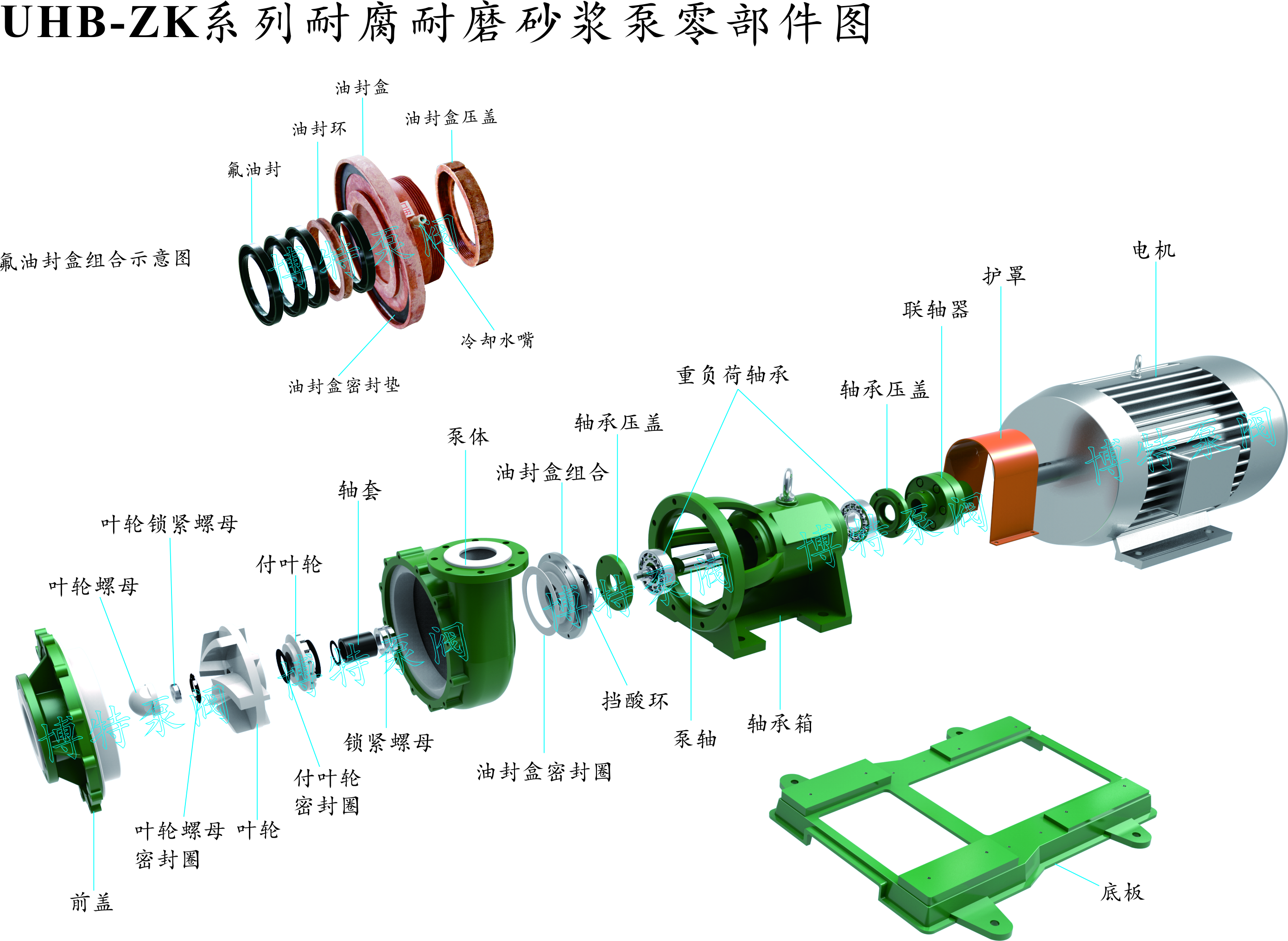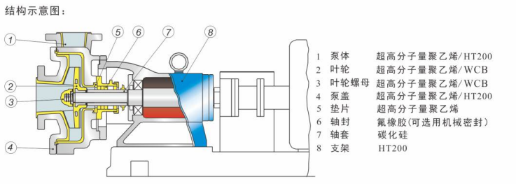 半開(kāi)式葉輪、單級(jí)單吸懸臂式離心泵,過(guò)流部件全部采用超高分子量聚乙烯緊襯或制造,襯層不小于8mm。泵的承重部分為金屬材料,既可配置氟橡膠負(fù)壓密封圈,外加水冷卻裝置,也可配置機(jī)械密封。